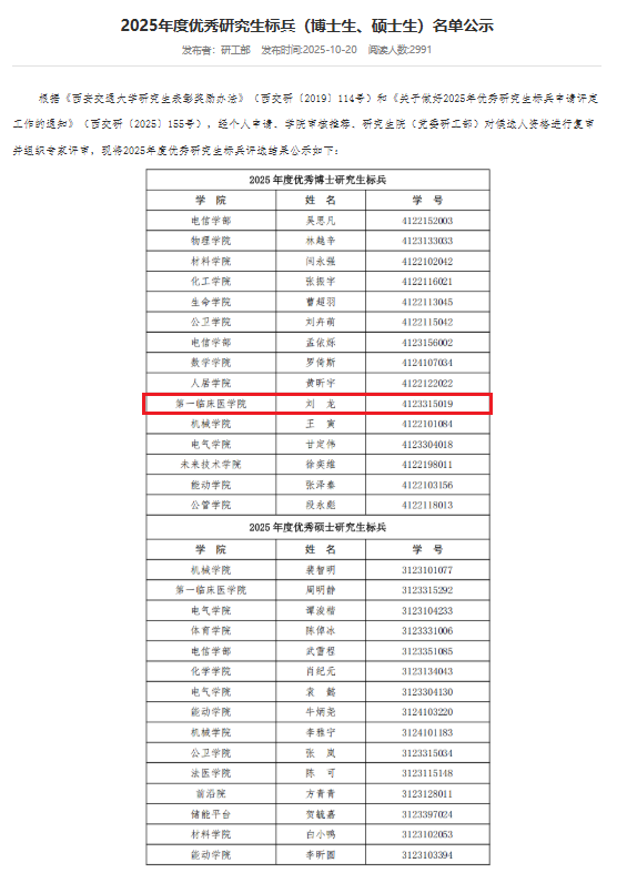 西安交通大学2025年“优秀研究生标兵”评选答辩圆满结束,外科梦工场博士研究生刘龙获“优秀博士研究生标兵”荣誉称号。根据《西安交通大学研究生表彰奖励办法》(西交研〔2019〕114号)和《关于做好2025年优秀研究生标兵申请评定工作的通知》(西交研〔2025〕155号),学校每年评选优秀硕士研究生标兵15名,优秀博士研究生标兵15名,这是学校授予研究生个人的最高荣誉,是当年度研究生国家奖学金获得者的优秀代表。
