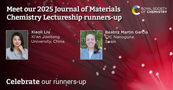 近日,由英国皇家化学会旗下Journal of Materials Chemistry A 、B 和 C 联合评选的讲座奖 (Journal of Materials Chemistry Lectureship)结果揭晓,刘晓丽教授和西班牙 CIC nanoGUNE 研究中心 Beatriz Martin-Garcia博士获得了 2025 年度 Journal of Materials Chemistry Lectureship runner-up,英国伦敦大学学院何冠杰教授获得讲座奖。