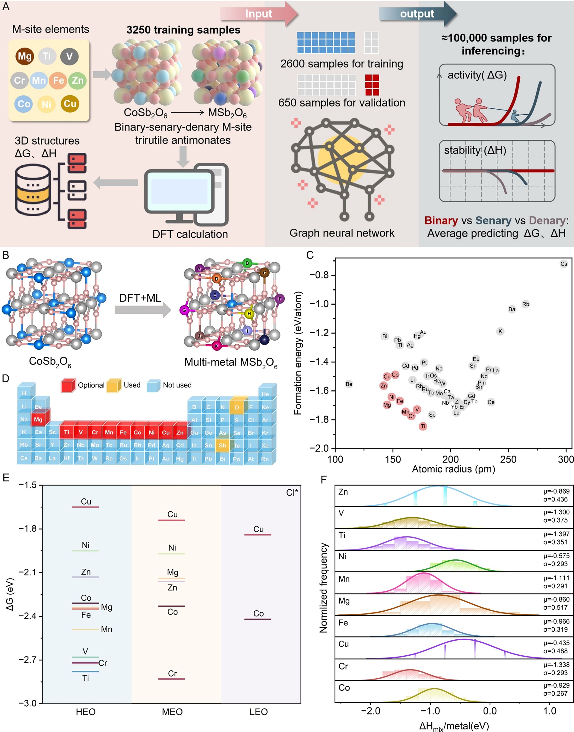 针对这一挑战,团队吕毅教授、刘晓菲副研究员以及动力工程多相流国家重点实验室沈少华教授等提出了原子级“熵引导”(entropy-guided)材料发现策略,从单一的CoSb2O6结构出发,通过DFT系统计算不同金属取代后形成能与晶格兼容性,从元素周期表中筛选出10种金属构建可稳定共存的高熵体系(MSb2O6,M = Mg, Ti, V, Cr, Mn, Fe, Co, Ni, Cu, Zn)。进一步结合图神经网络(GNN)与蒙特卡洛采样,在10⁵个可能构型中预测出最具热力学与电催化优势的组合,揭示高熵材料的多组元无序结构可降低体系自由能(ΔG = ΔH − TΔS)并优化活性位的电子分布。理论计算表明,随着金属组元由2、6到10种逐步增加,反应能垒不断降低,Cu位点成为最优活性中心。