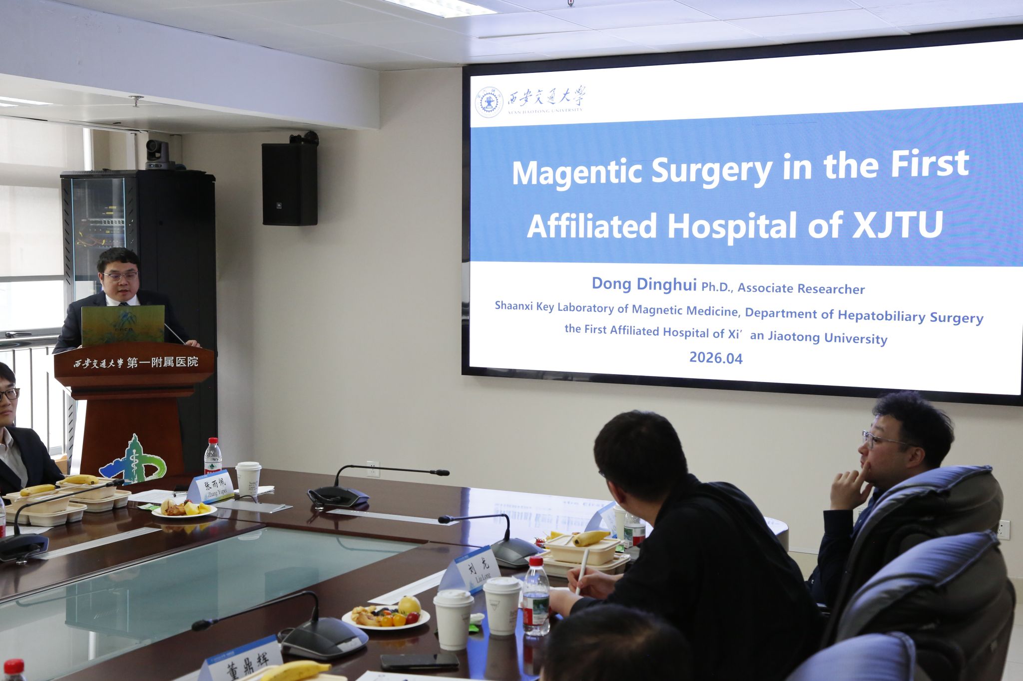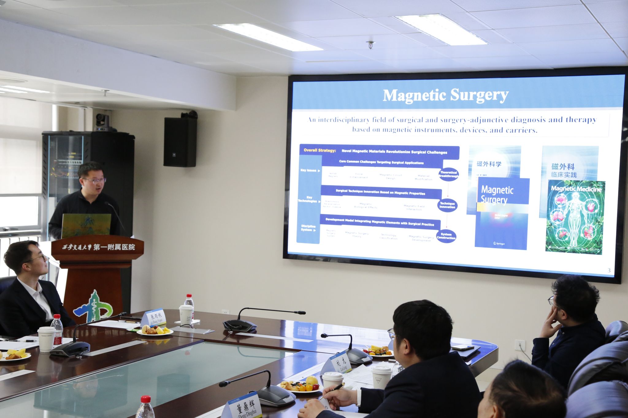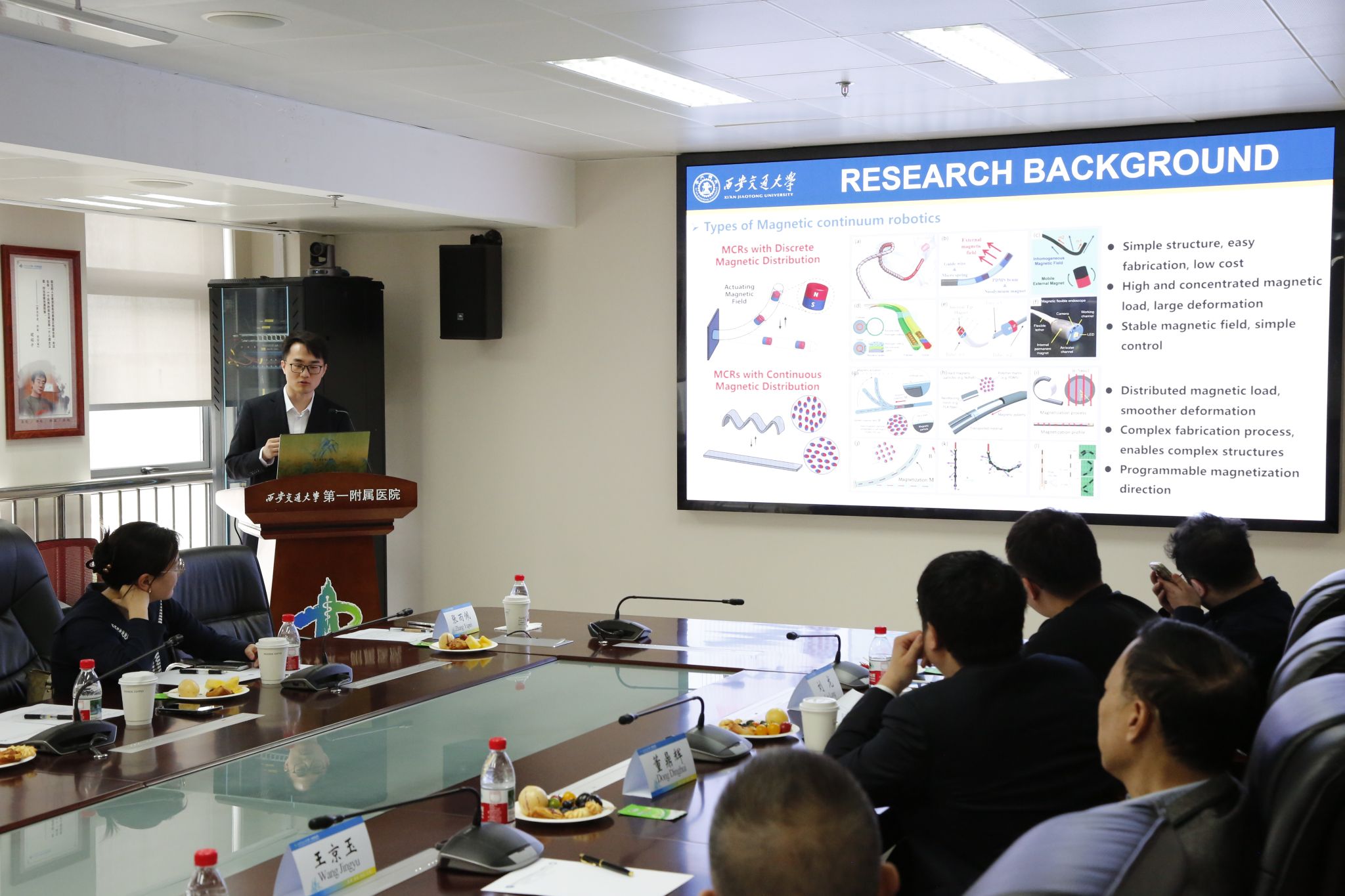 随后,董鼎辉副研究员全面介绍医院磁外科学科建设、技术研发与临床转化进展;博士研究生张雨沛、刘龙分别围绕磁驱动连续体机器人建模与临床应用、手术磁场暴露背向磁力牵引装置研究作详细汇报。