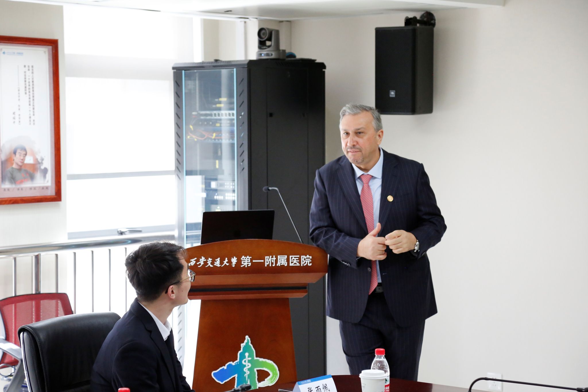 4 月 6 日上午,磁控微型医疗机器人领域国际顶尖学者、美国国家工程院院士、欧洲科学院院士、土耳其科奇大学校长 Metin Sitti 教授应邀到访西安交通大学第一附属医院,围绕磁控微型医疗机器人前沿技术与临床转化开展学术交流。第一附属医院院长吕毅教授,西安交通大学机械学院吕建教授、物理学院韩捷助理教授,一附院心血管外科王京玉主任医师、康复医学科敦旺欢副研究员、陕西省磁医学重点实验室副主任董鼎辉副研究员、精准外科与再生医学国家地方联合工程研究中心副主任马锋、科技部成果转化中心副主任王德普及部分外科梦工场师生参会。会议由一附院科技部副部长兼成果转化中心主任吴荣谦教授主持。